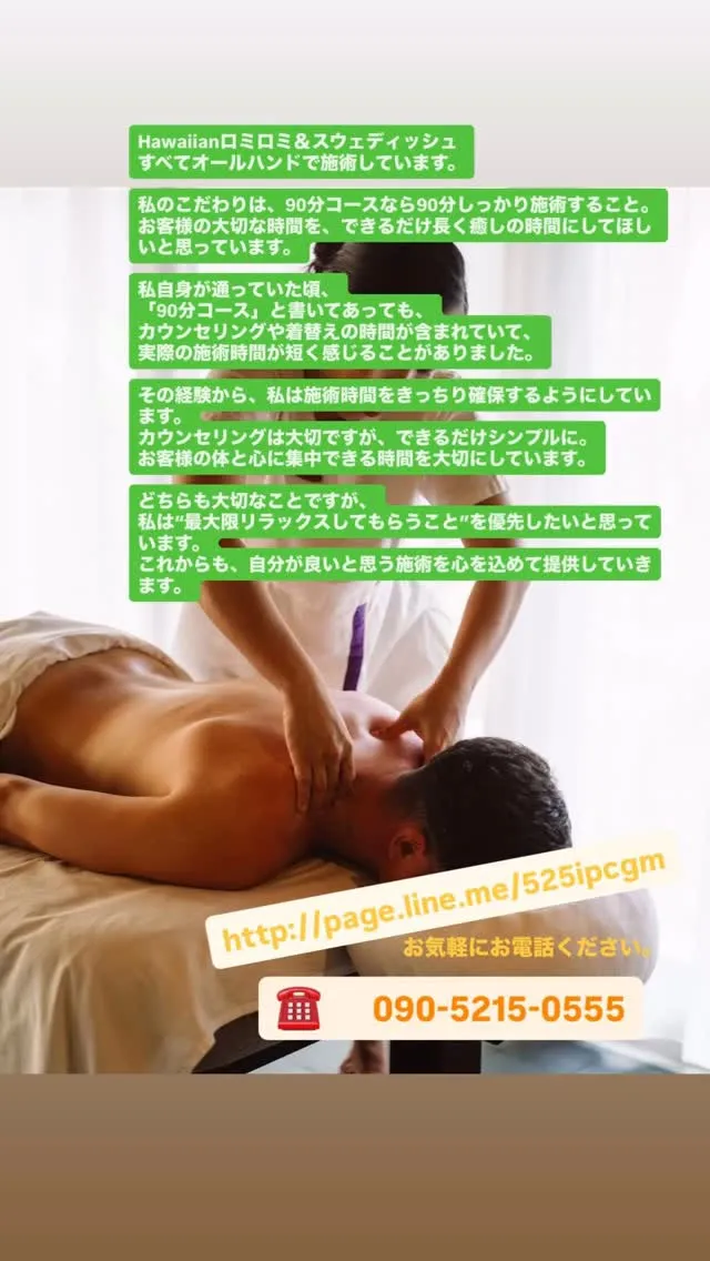 私のHawaiianロミロミは、すべてオールハンドの施術です...